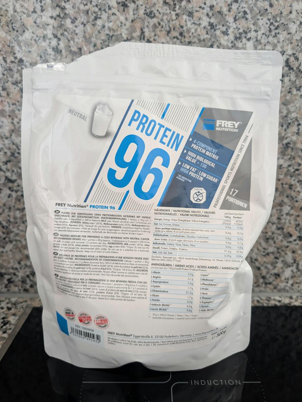 PROTEIN 96 ist ein modernes Mehrkomponenten-Protein, das durch eine spezielle Kombination aus Milchprotein, Molkenprotein-Isolat, Molkenprotein-Konzentrat und Eiprotein eine besonders hohe biologische Wertigkeit von über 136 erreicht. Der durchschnittliche Proteingehalt beträgt 96 % (i. Tr.), was es zu einer idealen Wahl für den Muskelaufbau und Diätphasen macht.